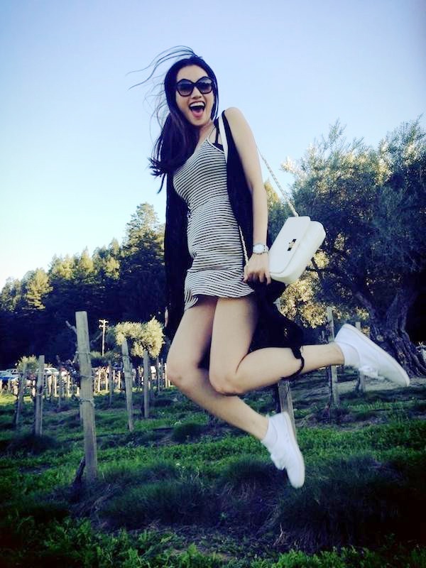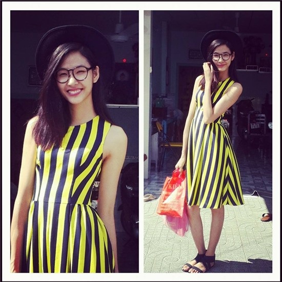 | Minh Hằng trẻ trung với thời trang váy kẻ. |