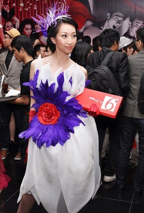 | Lều Phương Anh trở nên lòe loẹt và sến sẩm khi trang phục gắn bông hoa tím to bản. |
