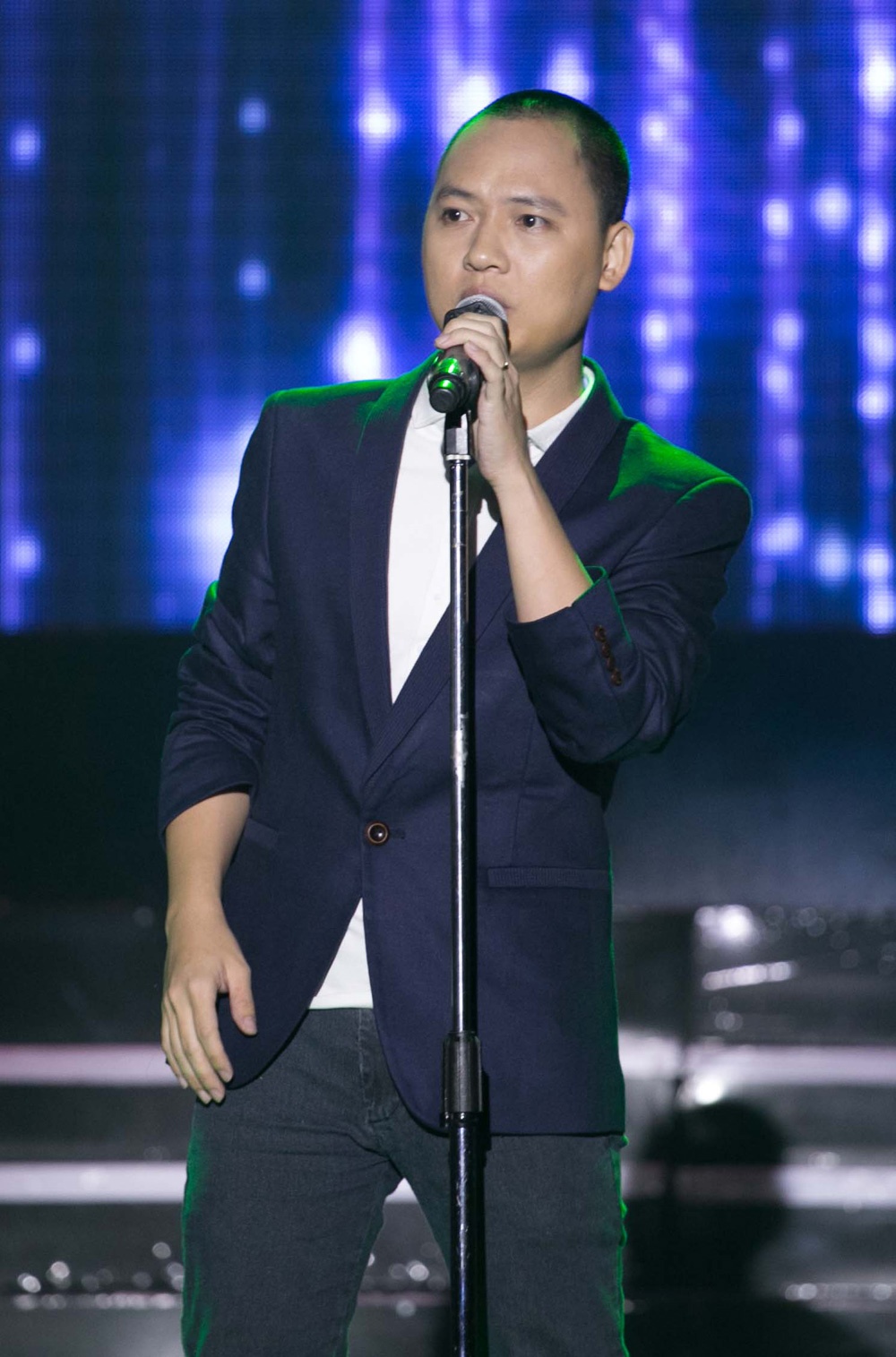 | Đông Hùng, chàng ca sĩ của Sao Mai điểm hẹn 2012 có phần trình diễn ăn ý với nhạc sĩ Nguyễn Hải Phong trong ca khúc Góc tối. |