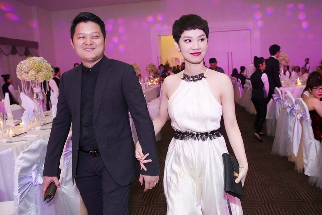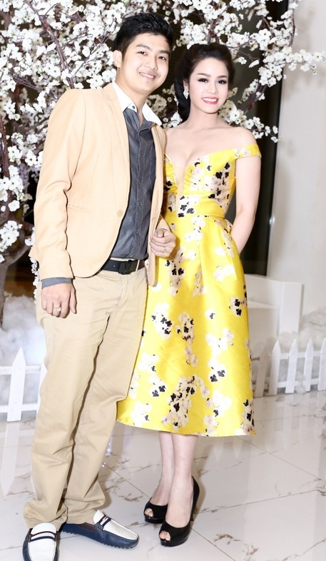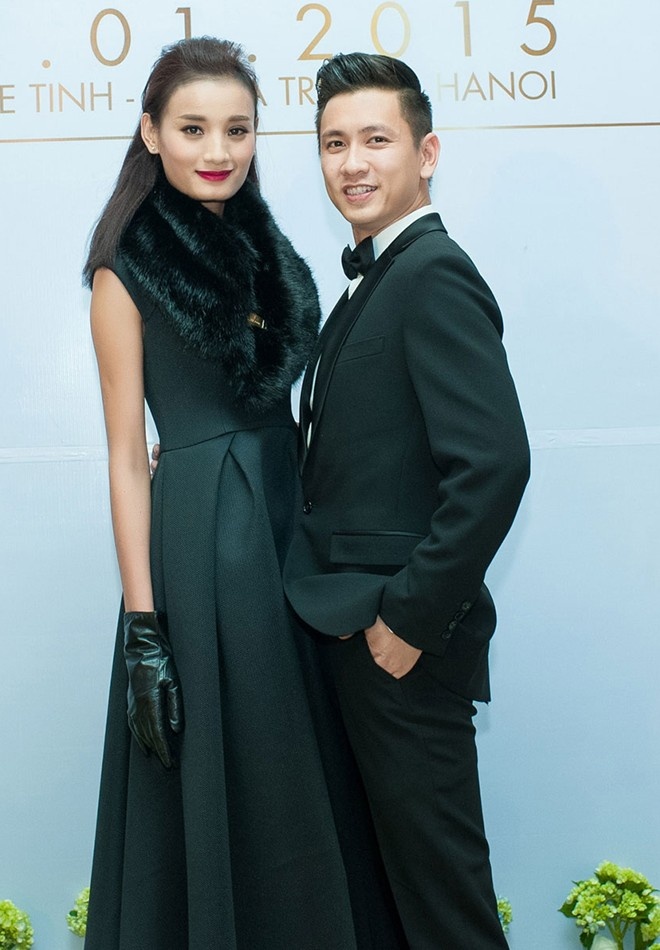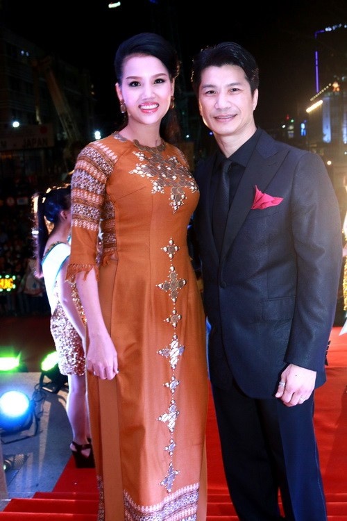 | Nữ diễn viên và chồng còn diện trang phục đồng tông màu khi sánh bước trên thảm đỏ. Hiện Lê Khánh - Tuấn Khải được đánh giá là một trong những cặp đôi mặc đẹp trên thảm đỏ sự kiện Vbiz 2014. |