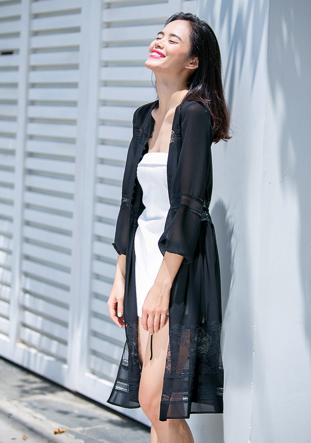 | Trong khi đó, người mẫu Thu Hiền lăng xê mốt gợi cảm. Set đồ của cô thể hiện sự tự tin, phóng khoáng của người mặc. Áo voan tối màu bên ngoài thuộc list trào lưu đang được săn đón. |