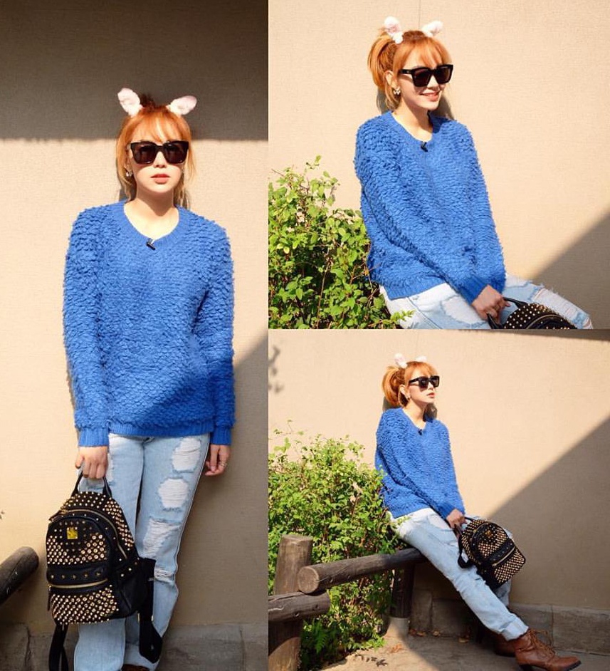 | Trong các chuyến du lịch mùa lạnh, Minh Hằng thường diện áo thun chất liệu len dày. Quần jeans rách đi kèm, phụ kiện balo cá tính. Người đẹp sinh năm 1987 còn đeo băng đô tai thỏ tinh nghịch. |