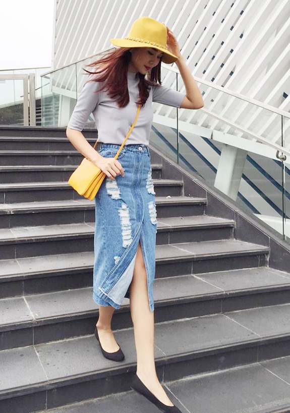 | Thanh Hằng cũng là một trong những tín đồ thời trang chuộng áo thun tay lỡ. Không nằm ngoài vòng xu hướng, siêu mẫu diện váy denim xẻ cân đối khi dạo phố ngày lạnh. |