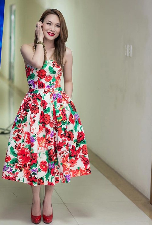 | Ca sĩ Mỹ Tâm trở nên trẻ trung và đáng yêu hơn với váy xòe in hoa vô cùng rực rỡ. |