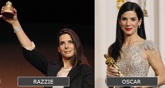 Trong quá khứ, có rất nhiều ngôi sao từng nhận đề cử Oscar và Mâm xôi vàng trong cùng năm. Đáng nhớ nhất hẳn là trường hợp của Sandra Bullock vào năm 2010. Cô “ẵm” giải Nữ diễn viên chính tệ nhất với bộ phim hài All About Steve, để rồi chỉ chưa đầy một ngày sau, minh tinh giành tượng vàng Oscar đầu tiên trong sự nghiệp với The Blind Side.