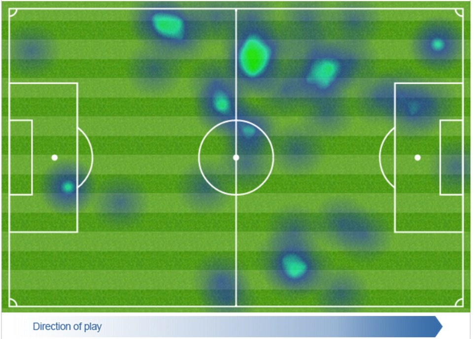 | Sơ đồ nhiệt mô tả tầm hoạt động của chủ nhân 2 bàn thắng, Diego Tardelli. |