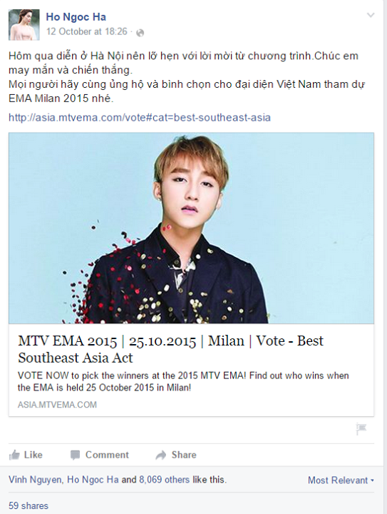 Mới đây, Hồ Ngọc Hà đã viết lời kêu gọi fan bình chọn cho nam ca sĩ trẻ Sơn Tùng M-TP. Nữ ca sĩ chia sẻ trên trang cá nhân: "Hôm qua diễn ở Hà Nội nên lỡ hẹn với lời mời từ chương trình. Chúc em may mắn và chiến thắng. Mọi người hãy cùng ủng hộ và bình chọn cho đại diện Việt Nam tham dự MTV EMA Milan 2015 nhé!".