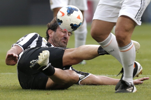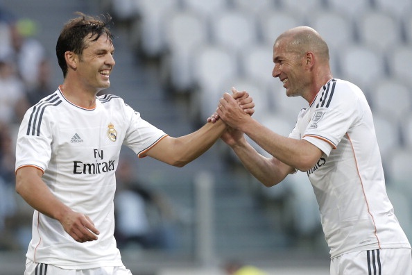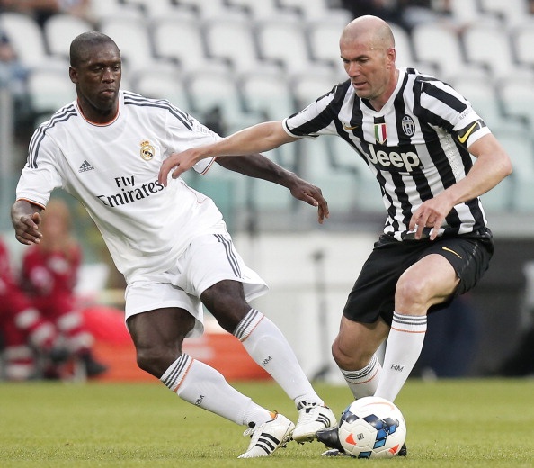 | Dù là cuộc chiến giữa những cầu thủ thuộc U40, song nó vẫn diễn ra quyết liệt và hấp dẫn. Trong ảnh: huyền thoại Real, Claude Makelele tranh bóng với Paolo Montero của Juve. |