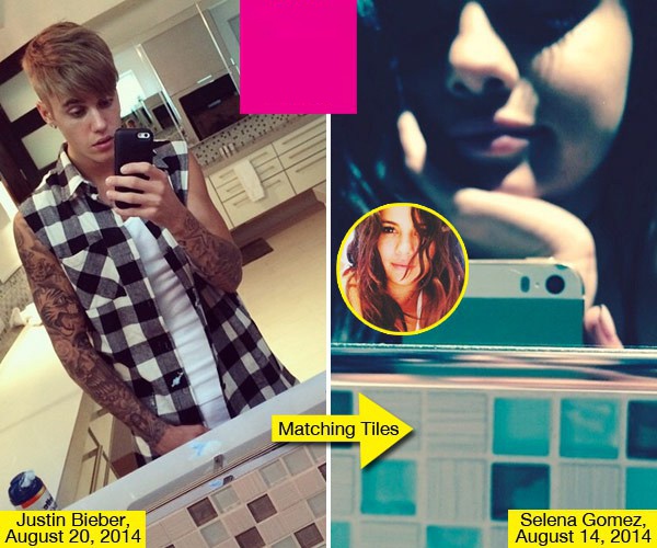 | 2 tấm hình tự sướng của Justin Bieber và Selena Gomez đã "tố cáo" khoảnh khắc gần gũi của cả hai. Tấm gương và hoa văn của những viên gạch lát hoàn toàn giống nhau. |