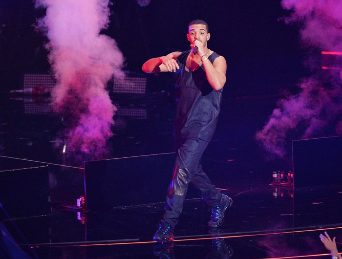 Drake trong phần trình diễn liên khúc Hold On, We’re Going Home và Started From the Bottom. |