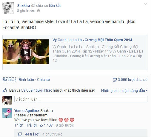 Hôm 4/8, fanpage của nữ ca sĩ Shakira bất ngờ chia sẻ tiết mục này kèm chú thích: "La La La, phong cách Việt Nam. Tôi yêu tiết mục này!".