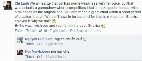 Tuy nhiên, bên cạnh những bình luận phấn khích trước phần hóa thân thành Shakira của Vy Oanh, có không ít ý kiến nhận xét, giọng ca Đồng xanh kém xa Shakira và khả năng tiếng Anh của cô quá kém. Ngay lập tức, các fan của Vy Oanh lên tiếng bảo vệ thần tượng. Nhiều người đã giới thiệu tỉ mỉ về chương trình Gương mặt thân quen và chia sẻ, nữ ca sĩ đến từ Việt Nam chỉ có chưa đầy một tuần để chuẩn bị mọi thứ và "hô biến" thành một người khác.