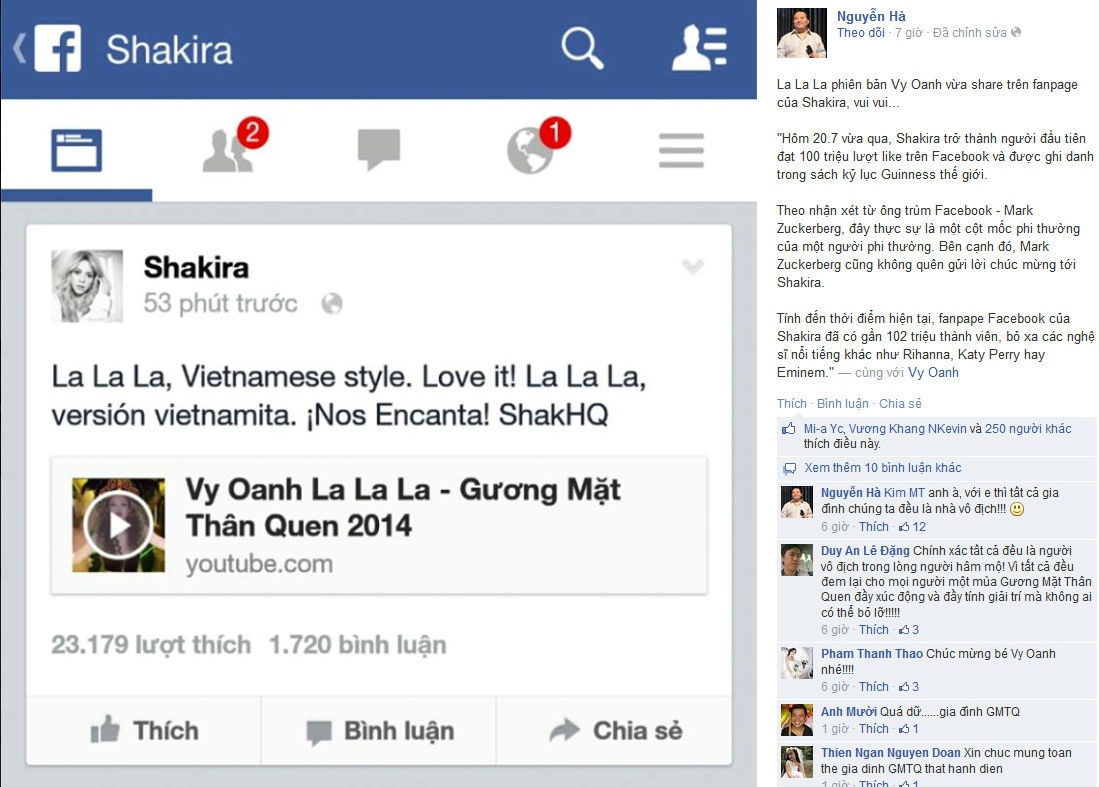 Trên trang cá nhân, nhạc sĩ Nguyễn Hà - người đảm nhận vai trò đạo diễn chương trình kiêm âm nhạc - cũng phấn khích trước việc Shakira chia sẻ tiết mục trong Gương mặt thân quen. Anh viết: "La la la phiên bản Vy Oanh vừa share trên fanpage của Shakira, vui vui".