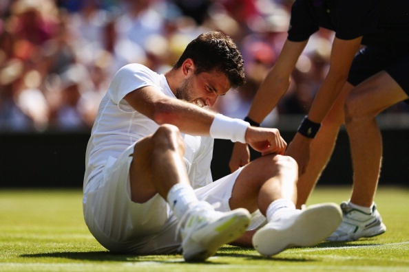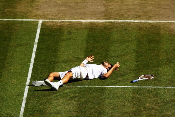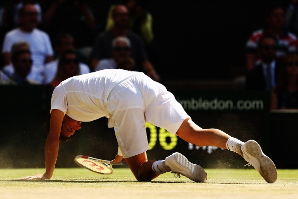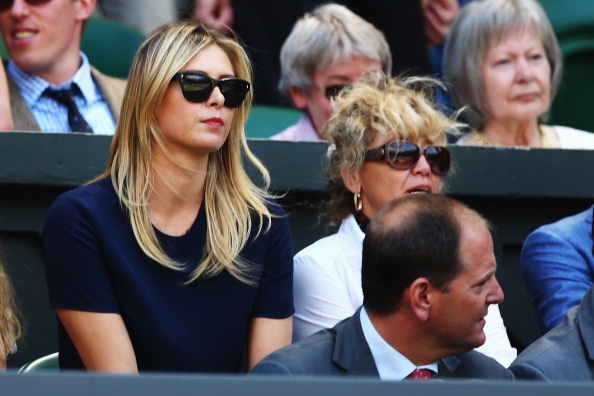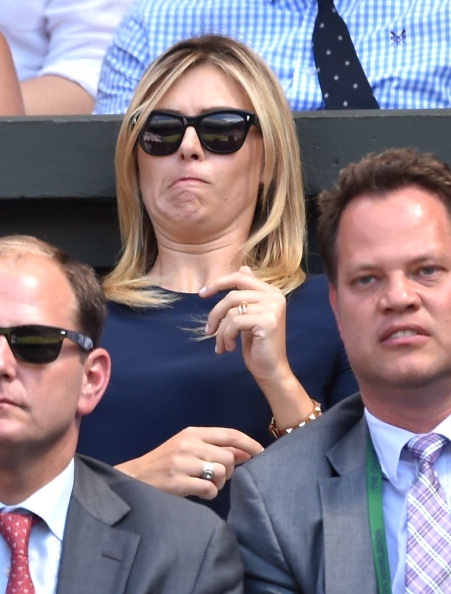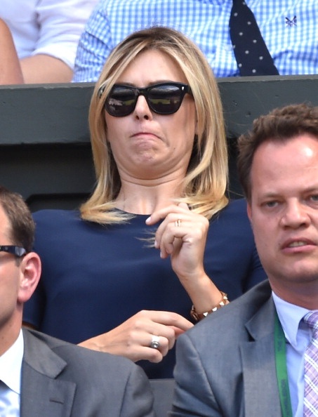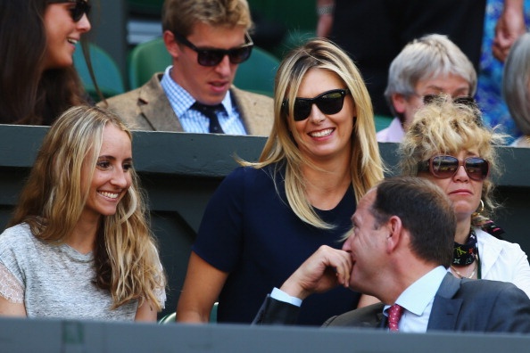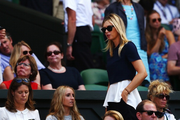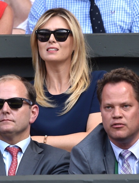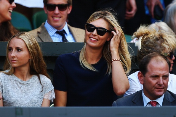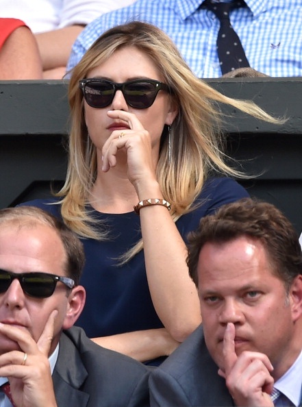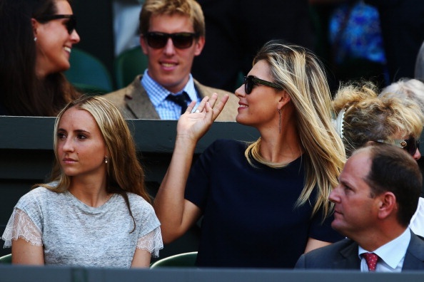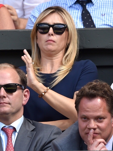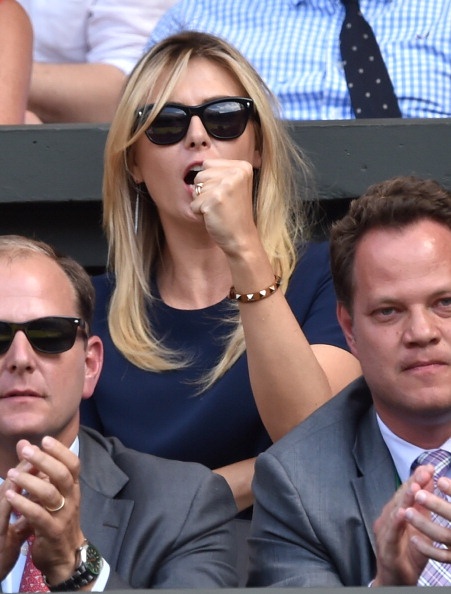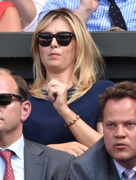 | Sharapova đến từ khá sớm để cổ vũ cho bồ trẻ, Grigor Dimitrov thi đấu tại trận bán kết đơn nam - Wimbledon 2014 với Novak Djokovic. |
