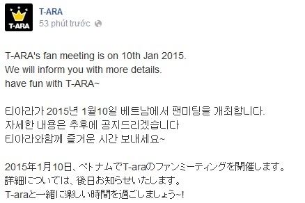 Mới đây, trang chính thức của T-ara tại Hàn Quốc đã cập nhật thông tin fanmeeting diễn ra tại Việt Nam. T-ara xác nhận ngày tổ chức mới là ngày 10/1/2015, tại sân khấu Lan Anh, TP.HCM. Thông báo ngắn gọn được đăng tải bằng tiếng Anh, Hàn và Nhật, góp phần khẳng định quyết định chuyển ngày mà ban tổ chức (BTC) ở Việt Nam đã đưa ra trước đó.