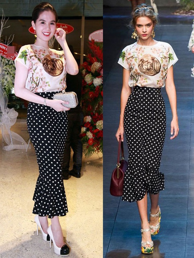 Lần mặc thời trang copy “nguyên bản gốc” mới đây nhất của Ngọc Trinh là trong một sự kiện diễn ra vào ngày 21/4. Người đẹp không ngại thừa nhận chiếc áo mình mặc là 100% của Dolce & Gabbana, trong khi chân váy "xào" 100% thiết kế cũng từ thương hiệu cao cấp này. Lý do Ngọc Trinh đưa ra sau đó là “tiết kiệm” và “tự thấy mình có thể may được”.