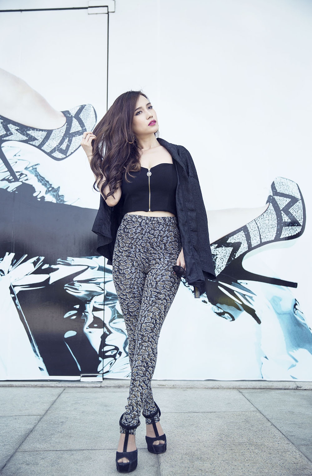 | Nữ VJ chứng tỏ khả năng đón đầu xu hướng khi diện quần ôm họa tiết và áo crop-top. |