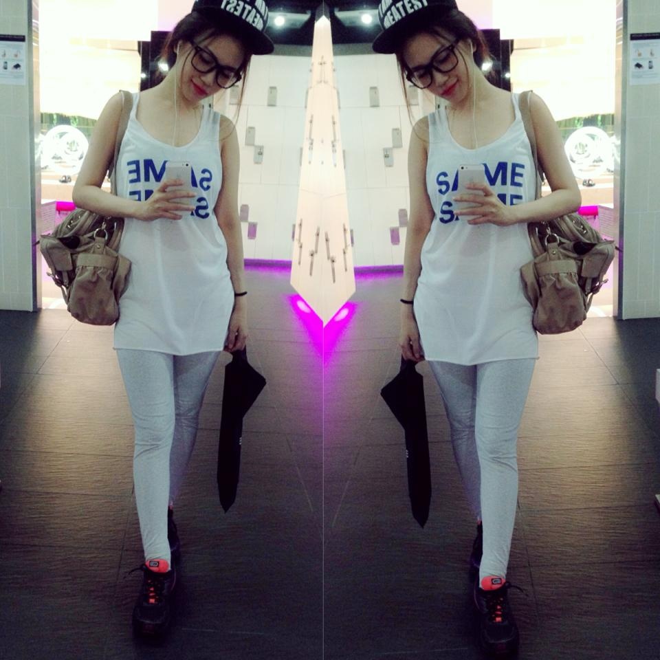 | Thời trang thể thao của Sĩ Thanh cũng không kém phần sành điệu với áo thun ba lỗ thoáng mát, quần leggings đi kèm theo quy tắc đồng màu và giày thể thao hiện đại. |