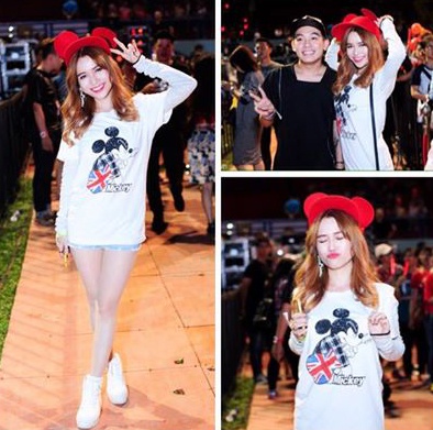 | Nữ ca sĩ nổi bật giữa sự kiện ngoài trời với phong cách xì tin, đáng yêu. Áo thun mix ăn ý cùng mũ chuột Mickey. |
