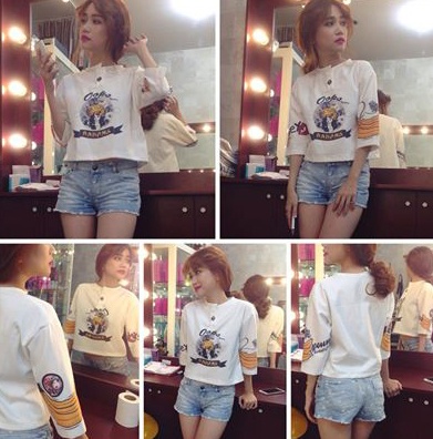 | Gu thời trang của Sĩ Thanh mang đậm nét trẻ trung, hiện đại và bắt kịp xu hướng. Khi xuống phố, cô chuộng những set trang phục thoải mái và phóng khoáng. Trong ảnh là áo thun sọc kẻ, mix cùng quần shorts ngắn và áo khoác lông sành điệu. |