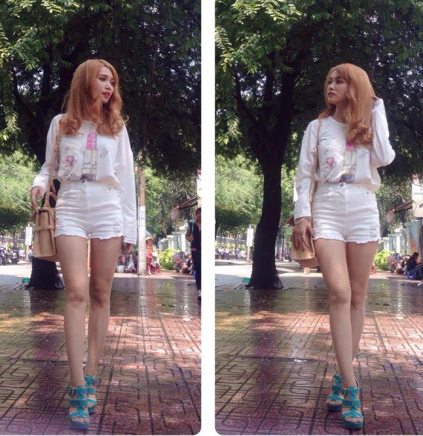 | Diện quần shorts jeans trông cô có phần trẻ trung, hiện đại hơn rất nhiều. |