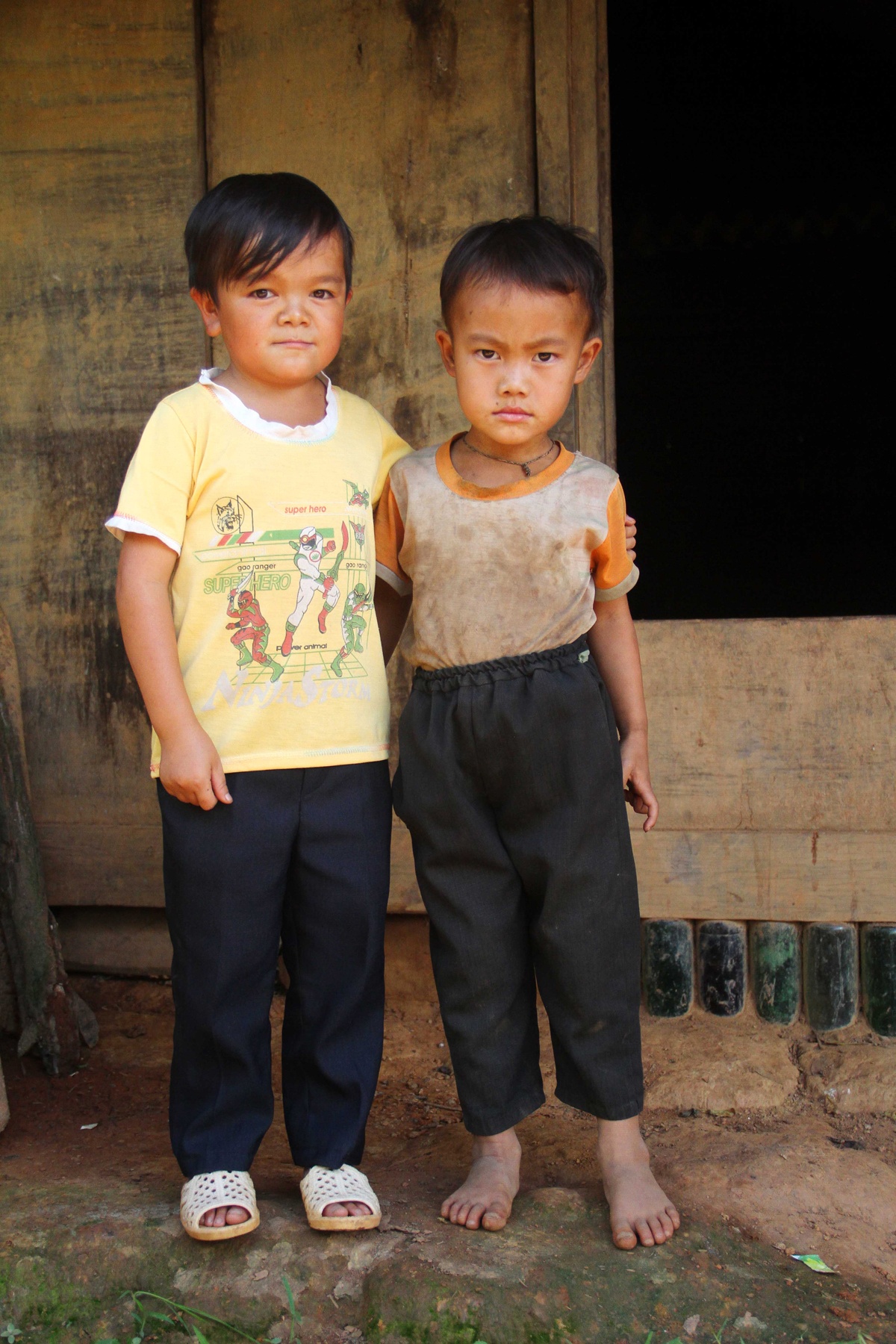 Em Sùng A Dì (trái), ở bản Hồ Nhì Pá, xã Lao Chải, huyện Mù Cang Chải (Yên Bái). Do mắc bệnh liệt tuyến Yên bẩm sinh nên chàng trai sinh năm 1995 này chỉ cao 90 cm, nặng 16 kg. Trong ảnh, Dì đang đứng cạnh người em ruột 3 tuổi của mình.