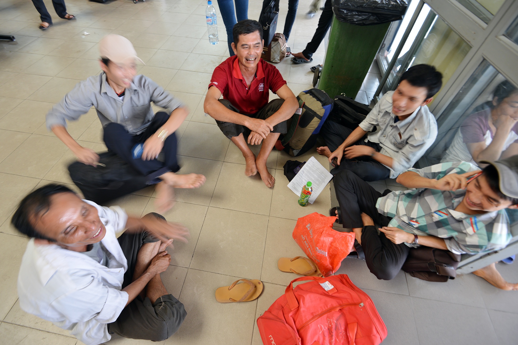 Anh Giang (áo đỏ) quê Tân Kỳ (Nghệ An) đợi tại bến xe từ 10h -12h30 nhưng chưa có xe đi. Anh cho biết: "Hầu hết các xe về Thành phố Vinh, về Tân Kỳ thì phải đợi đến 3h chiều".