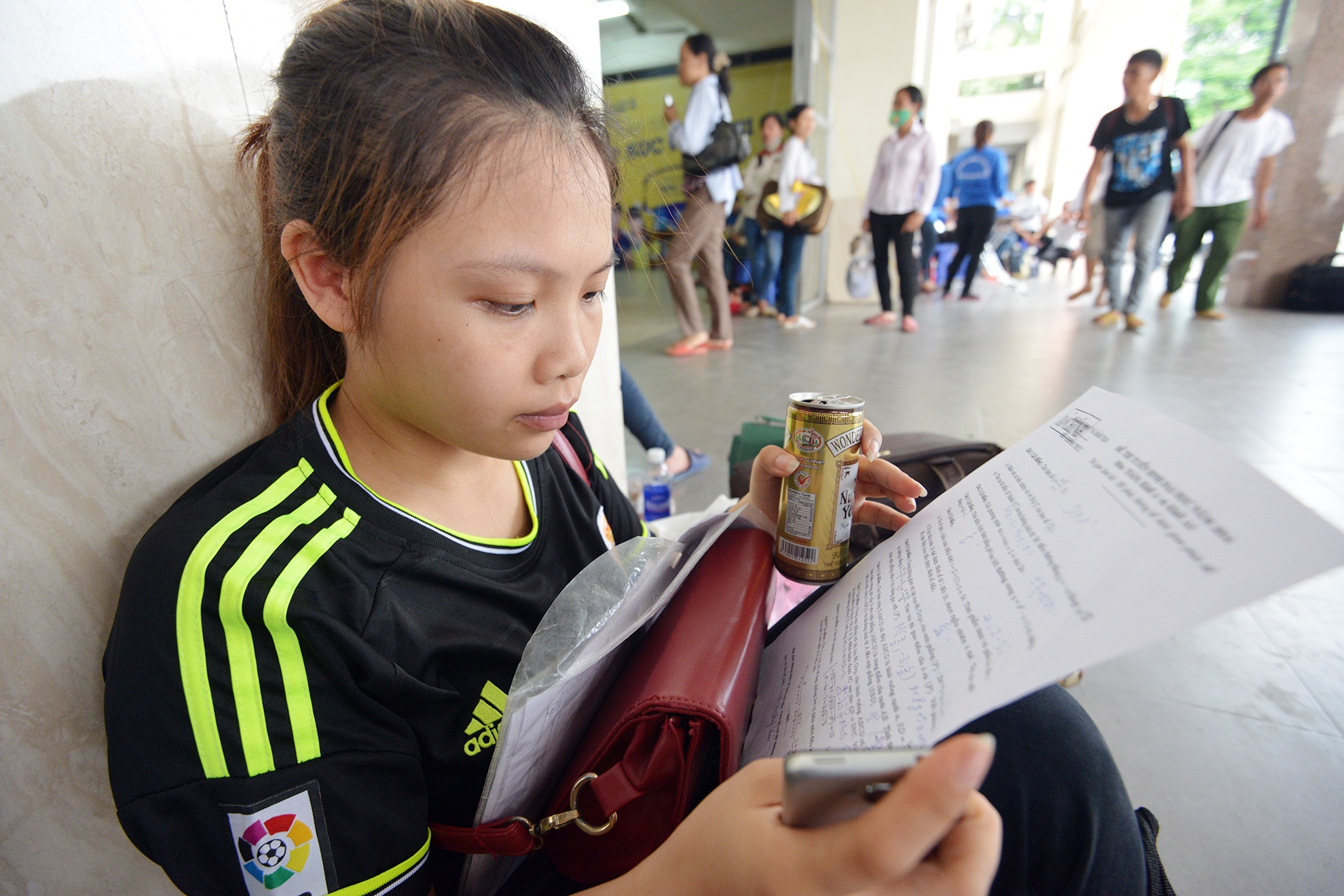| Trong khi đó Thảo (quê Nghệ An) lại khá hoang mang với phần thi của mình. Cô gái đi một mình ra Hà Nội tranh thủ xem lại đề thi môn Toán trước khi lên xe về quê. |