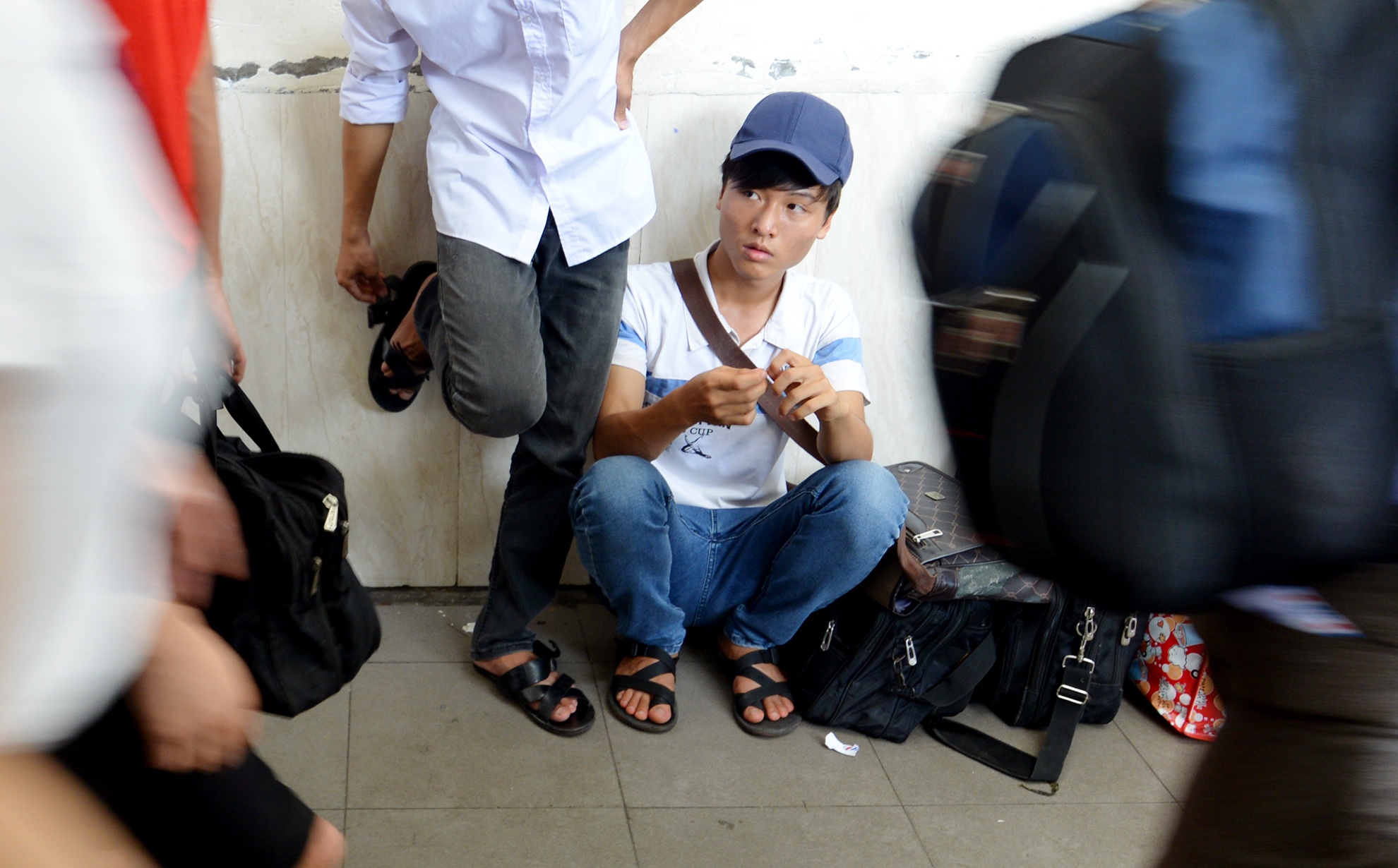 | Toàn ngồi giữa dòng người đi lại để chờ xe về quê. Sĩ tử quê Thanh Hà (Hải Dương) cho biết vừa hoàn thành tốt đẹp 3 môn thi vào trường Học viện Phòng không Không quân. "Em tính rồi, nắm chắc 23 điểm trong tay", Toàn nói. |