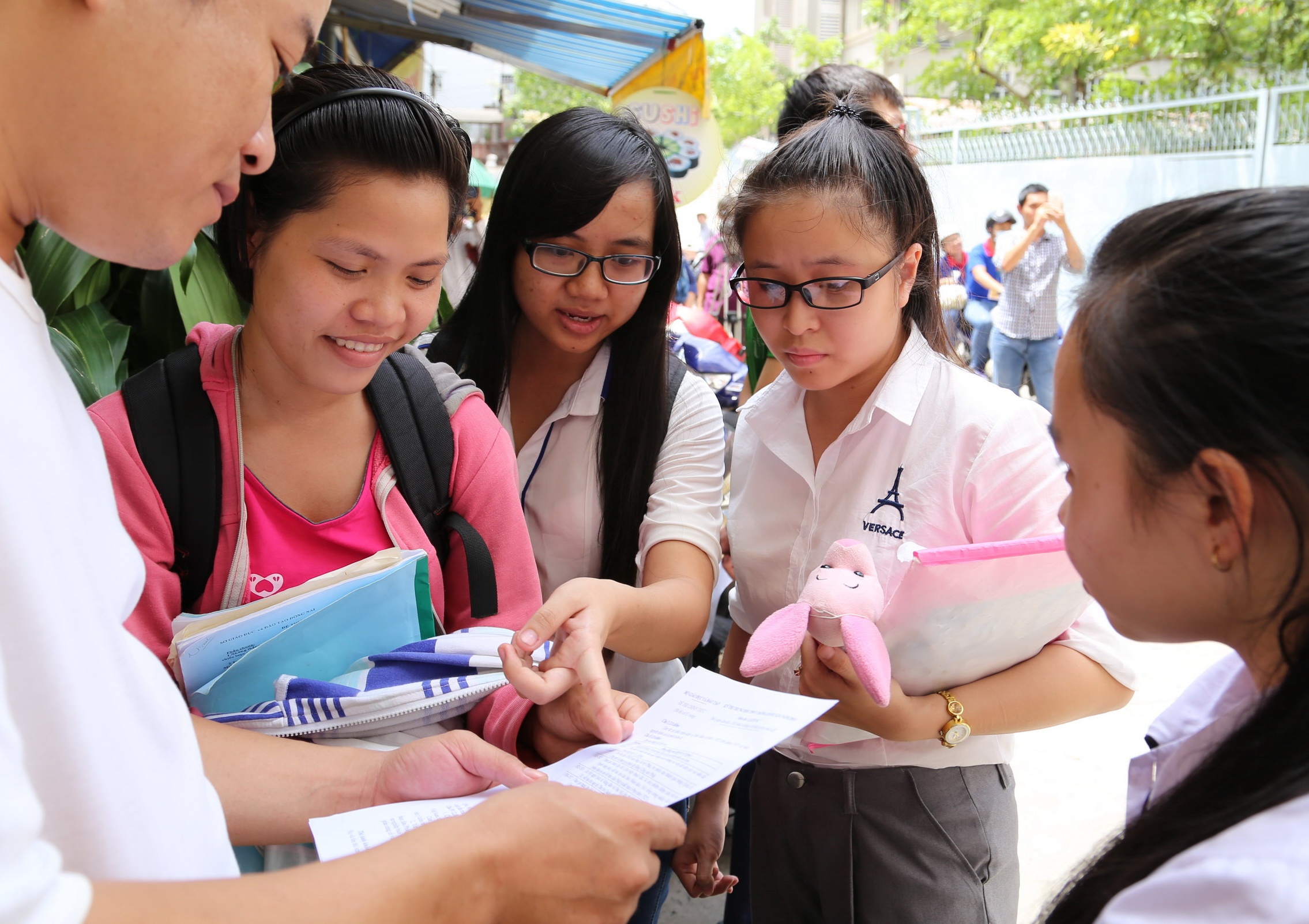 | Thí sinh trao đổi bài sau khi thi xong môn sử tại điểm thi Trường THPT Gia Định thuộc cụm thi ĐHQG, TP HCM. Ảnh: Tuổi Trẻ. |
