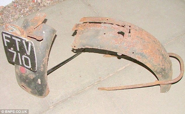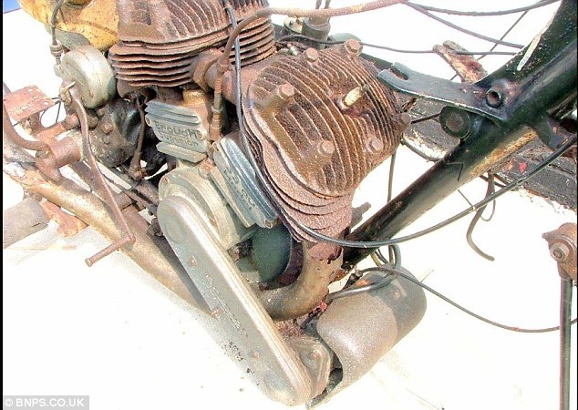 Siêu mô tô "đồng nát" không hề có bánh xe hay ống xả. Chỉ còn lại bộ khung, động cơ, phuộc, hộp số và chắn bùn. Toàn bộ phần kim loại đã bị gỉ sét. Bên cạnh đó là yên bọc da rách tả tơi.