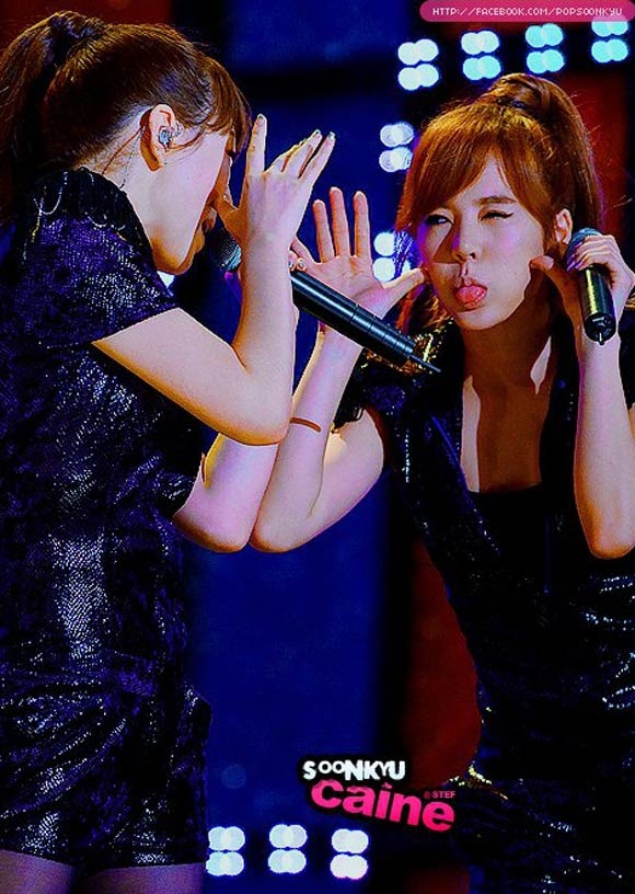 | Seohyun - Hyoyeon vừa biểu diễn vừa chơi oẳn tù tì. |