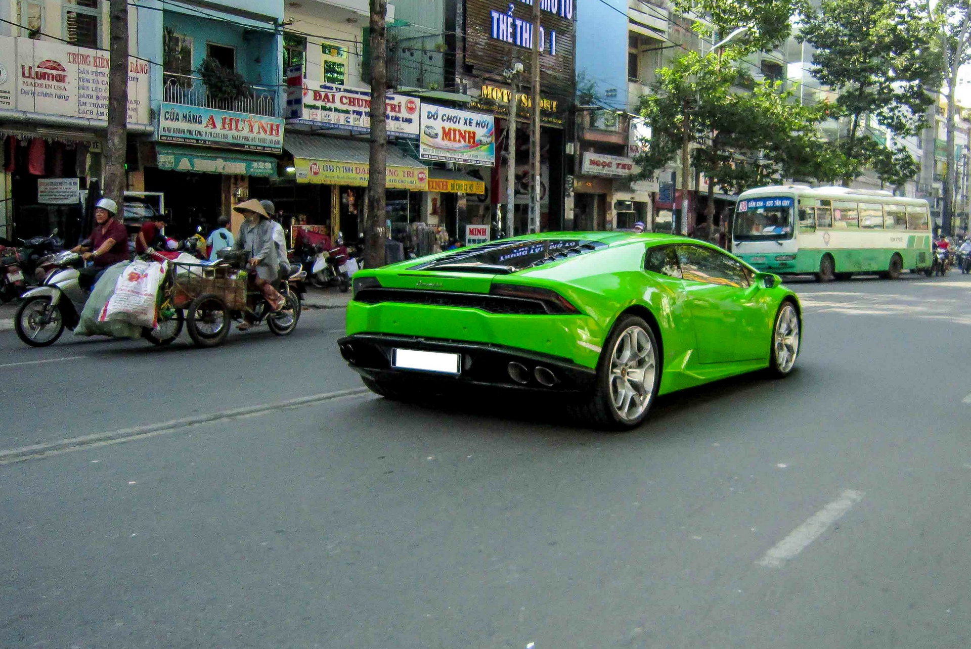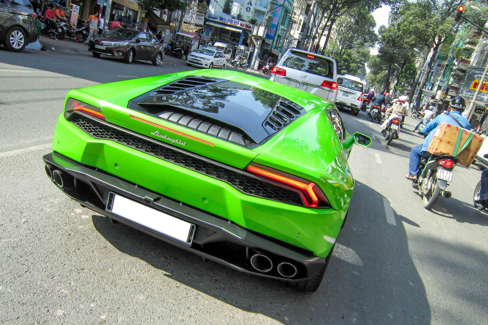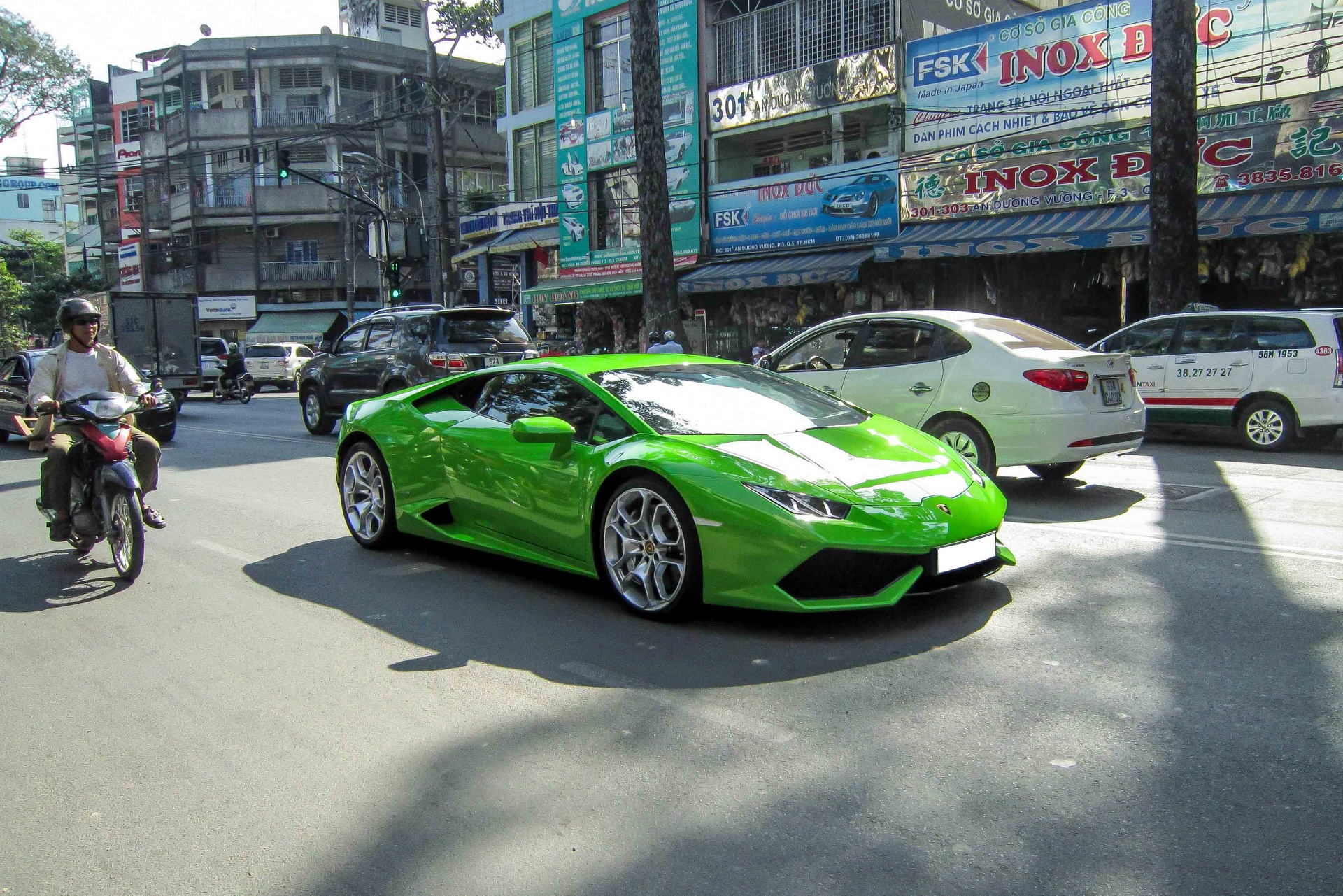 Siêu xe Huracan màu xanh lá lăn bánh trên đường Sài Gòn