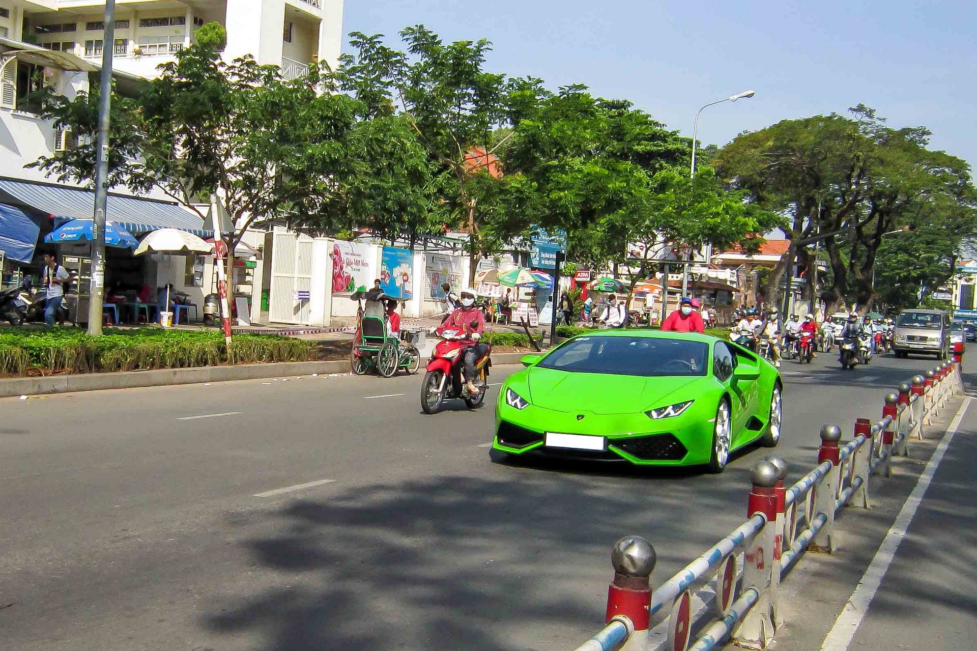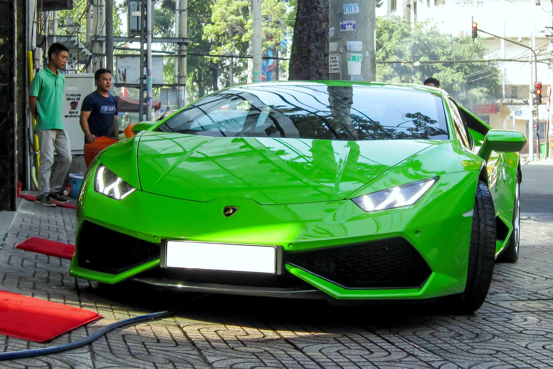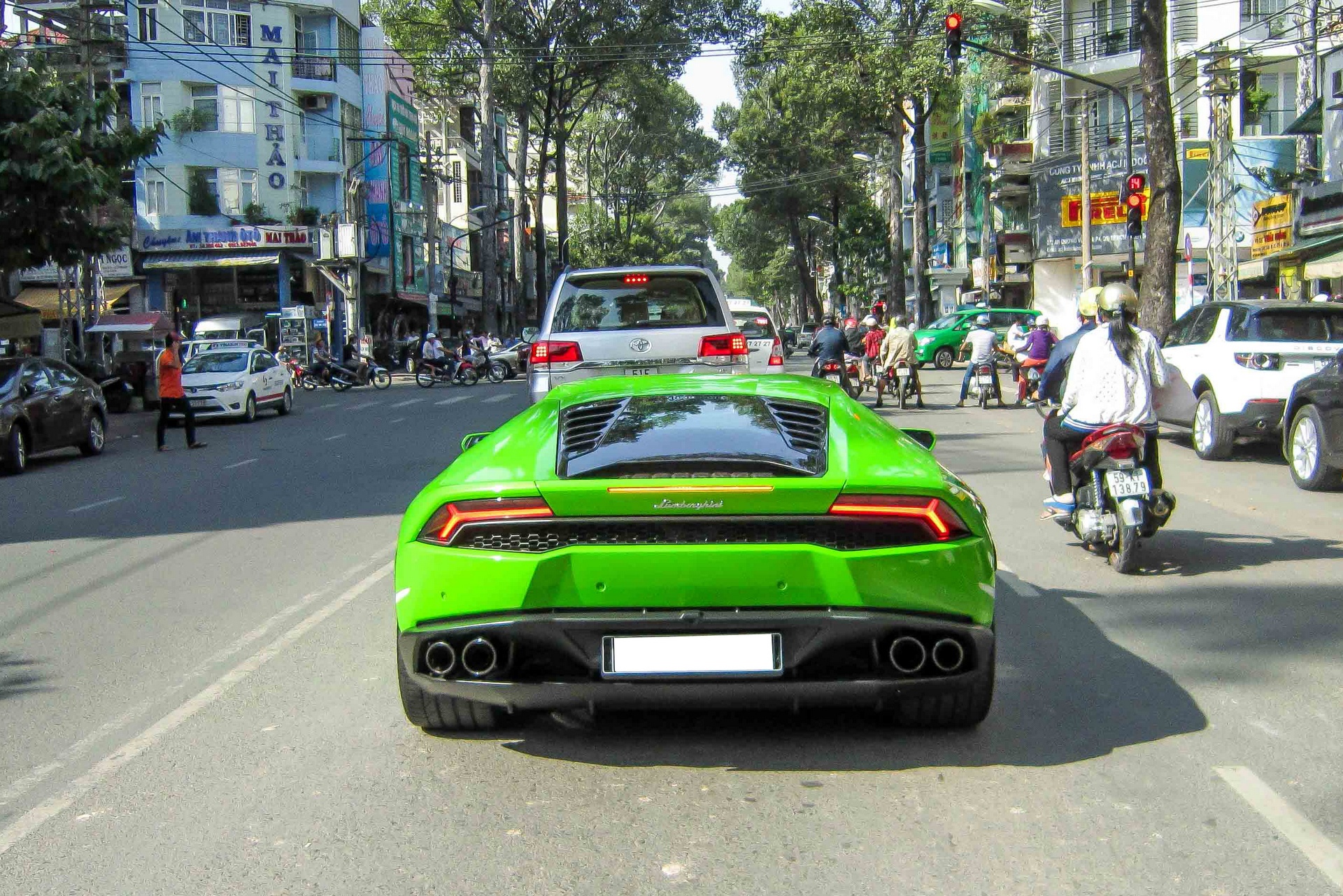 Siêu xe Huracan màu xanh lá lăn bánh trên đường Sài Gòn