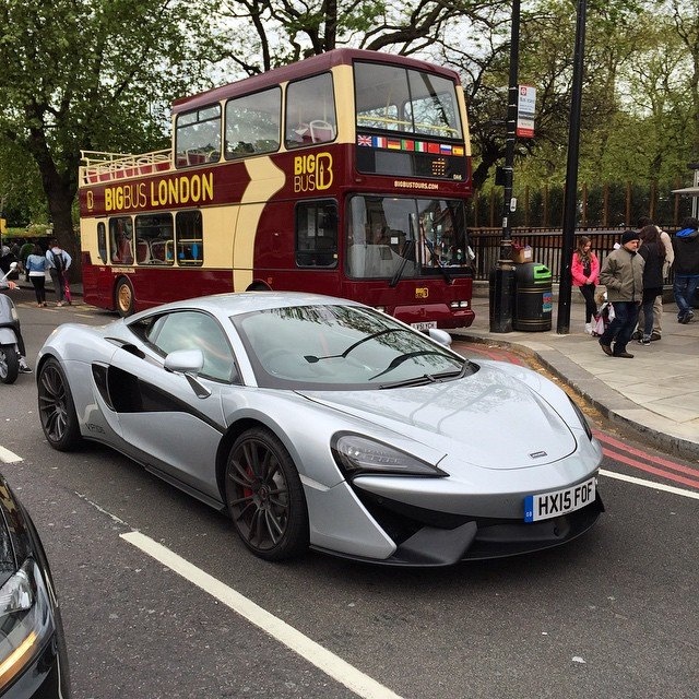 Chiếc McLaren 570S phiên bản thương mại xuất hiện trên đường phố London sau một tháng ra mắt. 570S là thành viên của Sports Series. Chiếc xe màu xanh bạc.