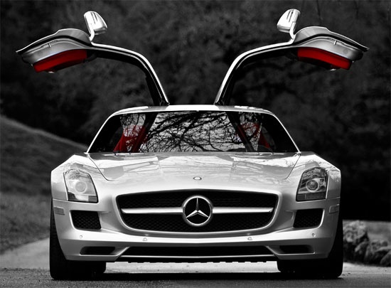 Mercedes SLS AMG là mẫu siêu xe có thiết kế cửa mở kiểu cánh chim độc đáo - kế tục của huyền thoại một thời 300SL Gullwing. Sản phẩm được hợp tác sản xuất bởi Mercedes và McLaren. Siêu xe được mệnh danh là "mũi tên bạc", với ngoại thất màu bạc mạnh mẽ cùng khả năng tăng tốc từ 0 lên 100 km/h trong vòng chỉ 3,8 giây, tốc độ tối đa 317 km/h. Cung cấp sức mạnh cho SLS AMG là khối V8 6,3 lít công suất 571 mã lực và mô-men xoắn cực đại 650Nm.
