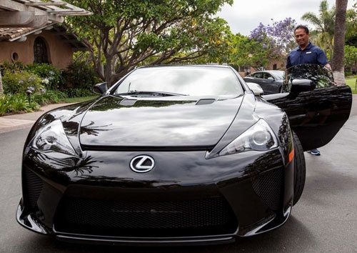 | Allan Nuguid đưa chiếc Lexus LFA vào bãi đậu ở khách sạn Rancho Valencia, Nam California. |