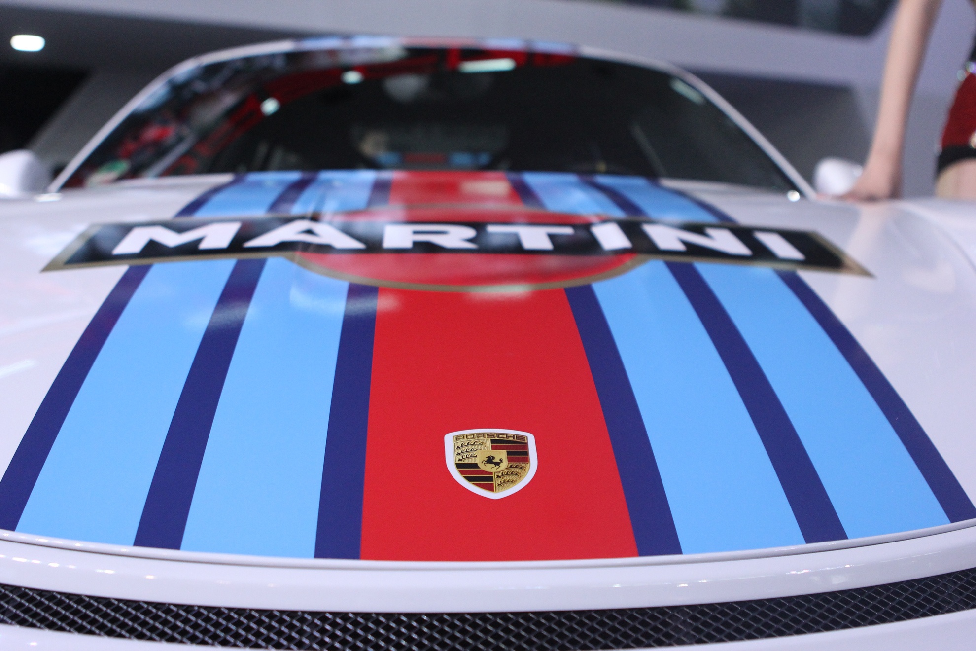 | Model vừa xuất hiện tại triển lãm Vietnam International Motor Show 2015 được dán decal Martini trên nắp ca-pô. |