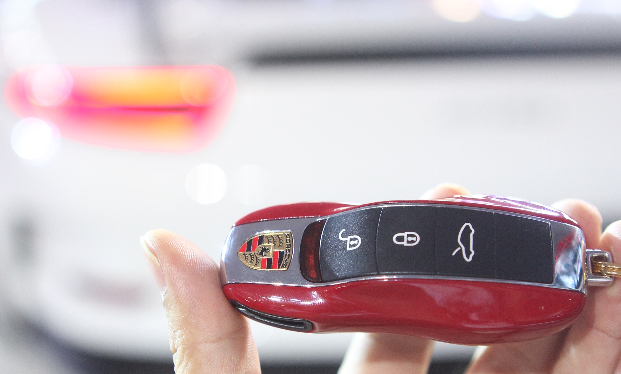 | Chìa khóa hình chiếc xe với logo Porsche. |