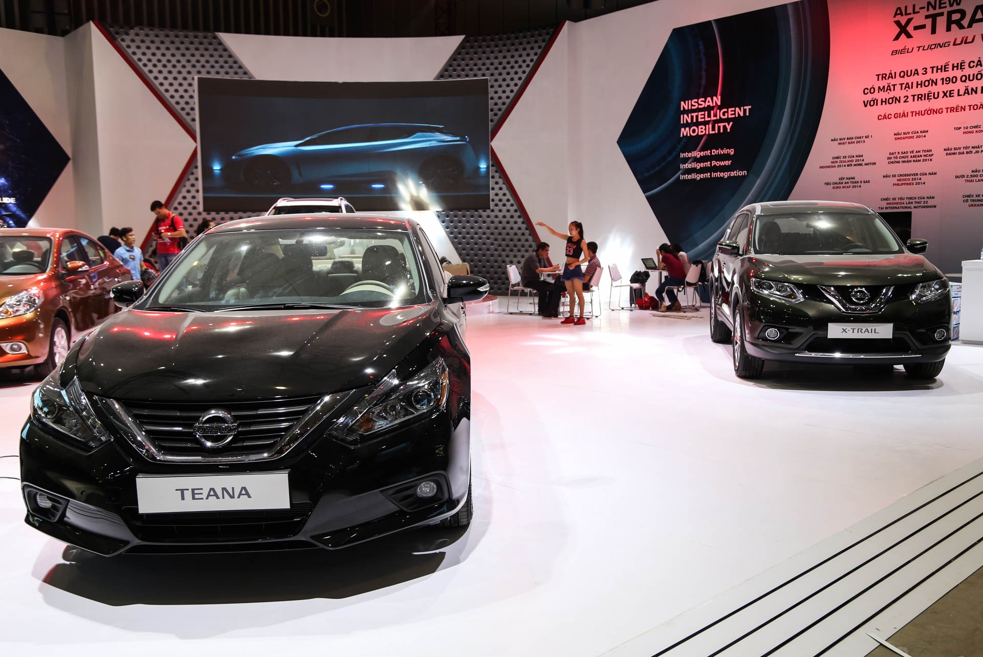 | Nissan đem tới triển lãm một số dòng xe mũi nhọn tại thị trường Việt Nam là sedan cỡ trung Teana và crossover X-Trail. Nissan Teana là đối thủ của Toyota Camry. Dòng xe này vẫn chưa chính thức ra mắt thị trường Việt nên chưa rõ giá bán. Riêng mẫu X-Trail là đối thủ của Mazda CX-5 có giá khởi điểm từ 1 tỷ đồng, lắp ráp tại Việt Nam. |