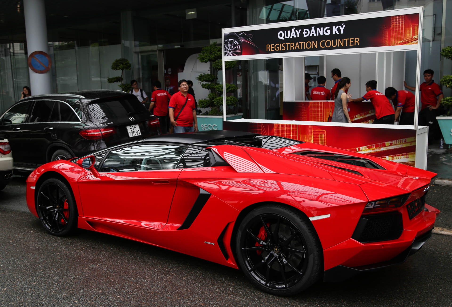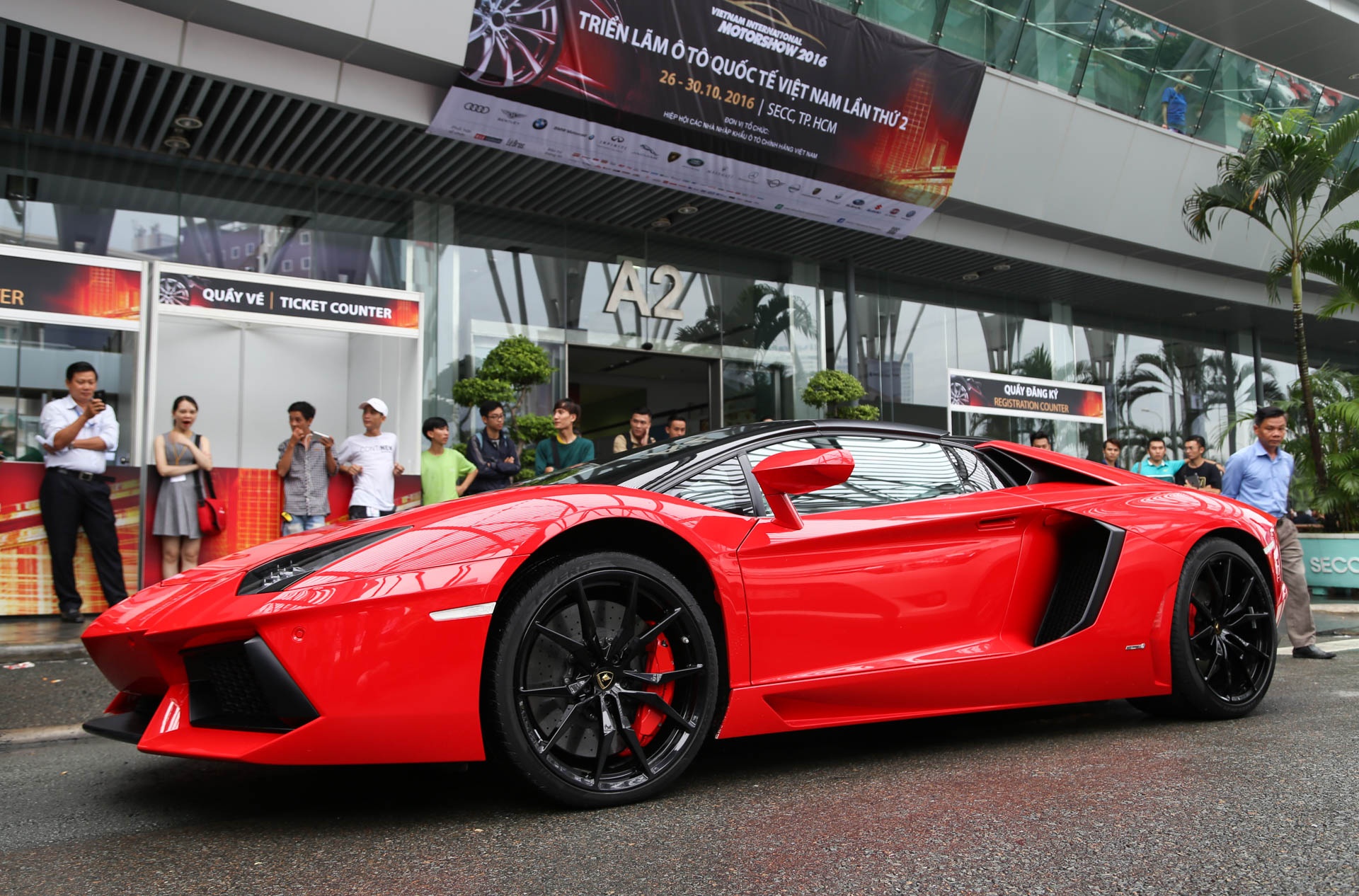 | Một số nhãn hàng phụ kiện đem siêu xe tới triển lãm năm nay để thu hút sự chú ý. Chiếc Lamborghini Aventador Roadster được chuyển từ Hà Nội vào để phục vụ triển lãm. |
