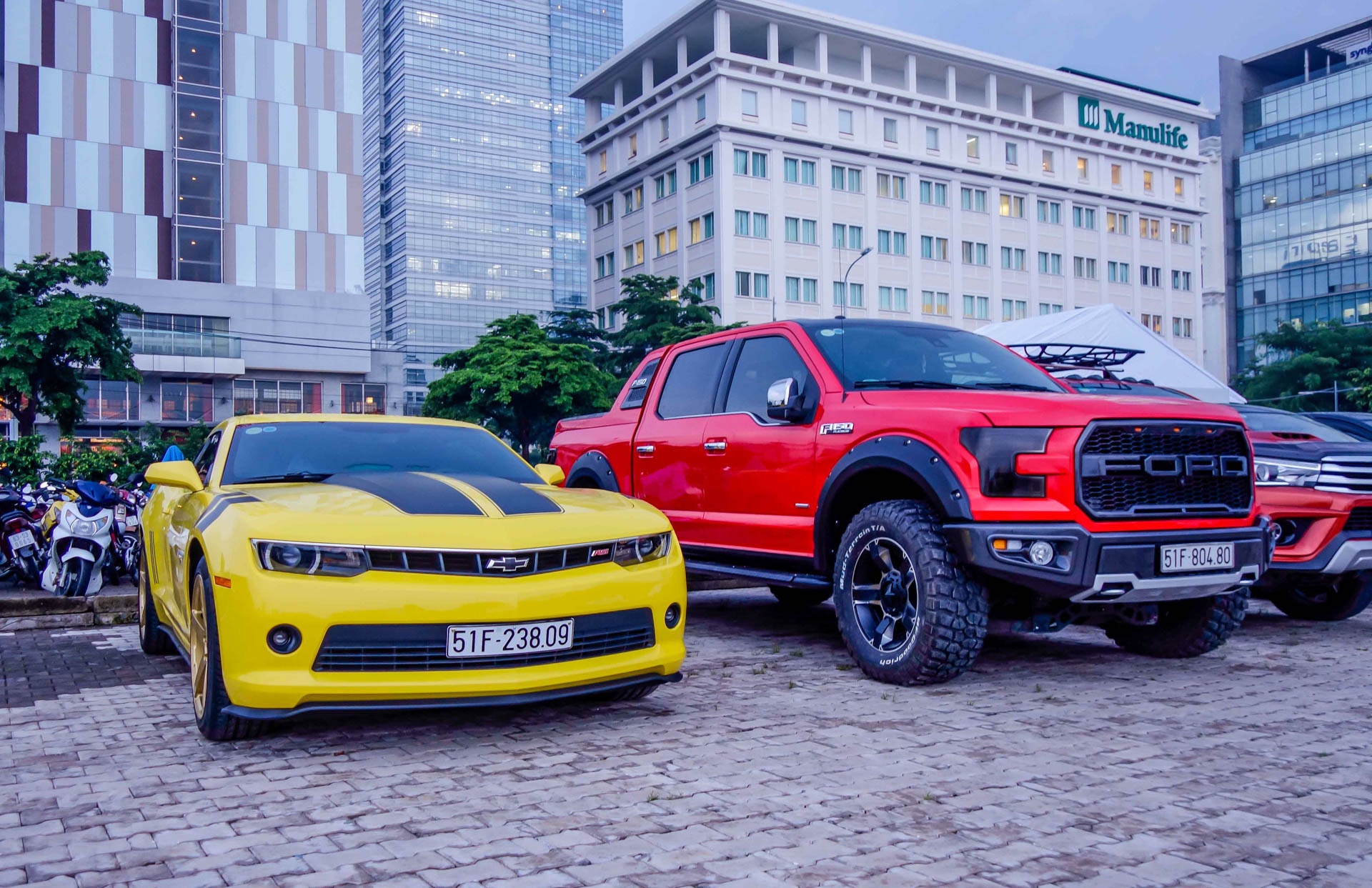 | Hai mẫu xe Mỹ hầm hố Chevrolet Camaro và Ford F150 tại bãi giữ xe. Ảnh: TNTBros.