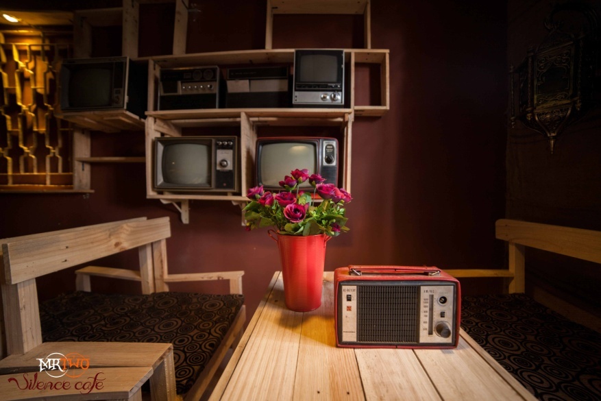 Quán được thiết kế theo phong cách cổ điển với những kệ gỗ, rèm treo hờ, ti vi, loa, radio, đồng hồ của những năm xa lắm. Những vật dụng ấy kết hợp với ánh đèn vàng gợi người ta nhớ đến bức tranh cuộc sống gia đình của những năm 90.