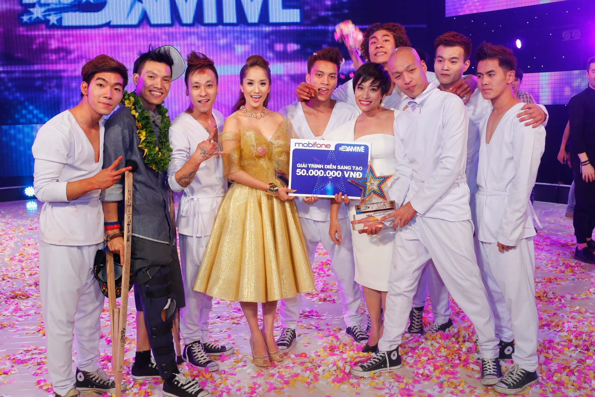 Giây phút vỡ òa của nhóm S.I.N.E khi được MC Khánh Thi xướng tên là người chiến thắng. Ảnh An Trần |