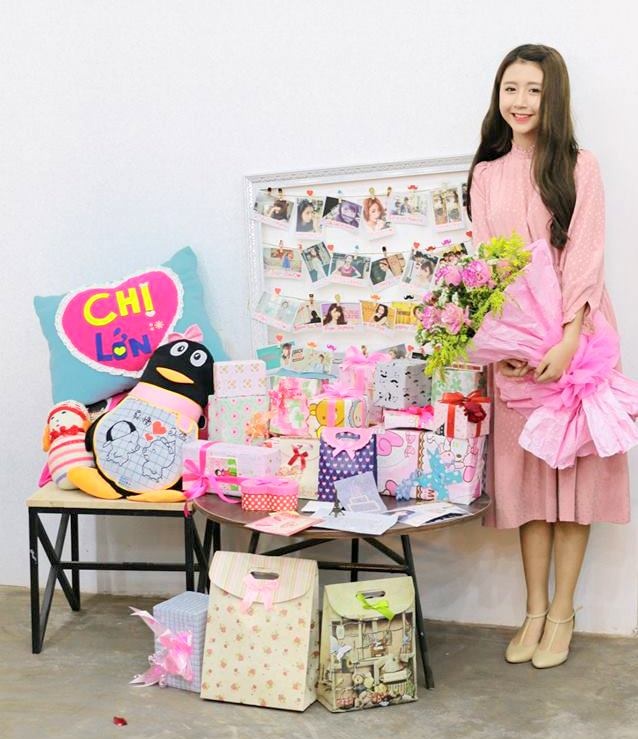 | Hot girl hạnh phúc bên những món quà đầy ý nghĩa fan hâm mộ dành tặng. |