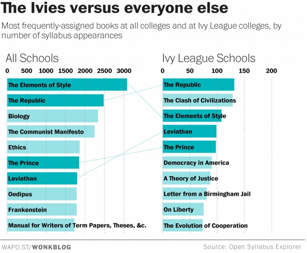 Tuy nhiên, danh sách các cuốn giáo trình phổ biến của sinh viên 7 trường thuộc Ivy có điểm khác biệt. Tại đây, đứng đầu là Republic. Clash of Civilizations (Cuộc chiến giữa các nền văn minh) của Samuel Huntington đứng thứ hai. Tiếp theo là The Elements of Style, Leviathan, The Prince. Cuốn Letter from a Birmingham Jail (Lá thư từ ngục Birmingham) của Martin Luther King xếp thứ tám.