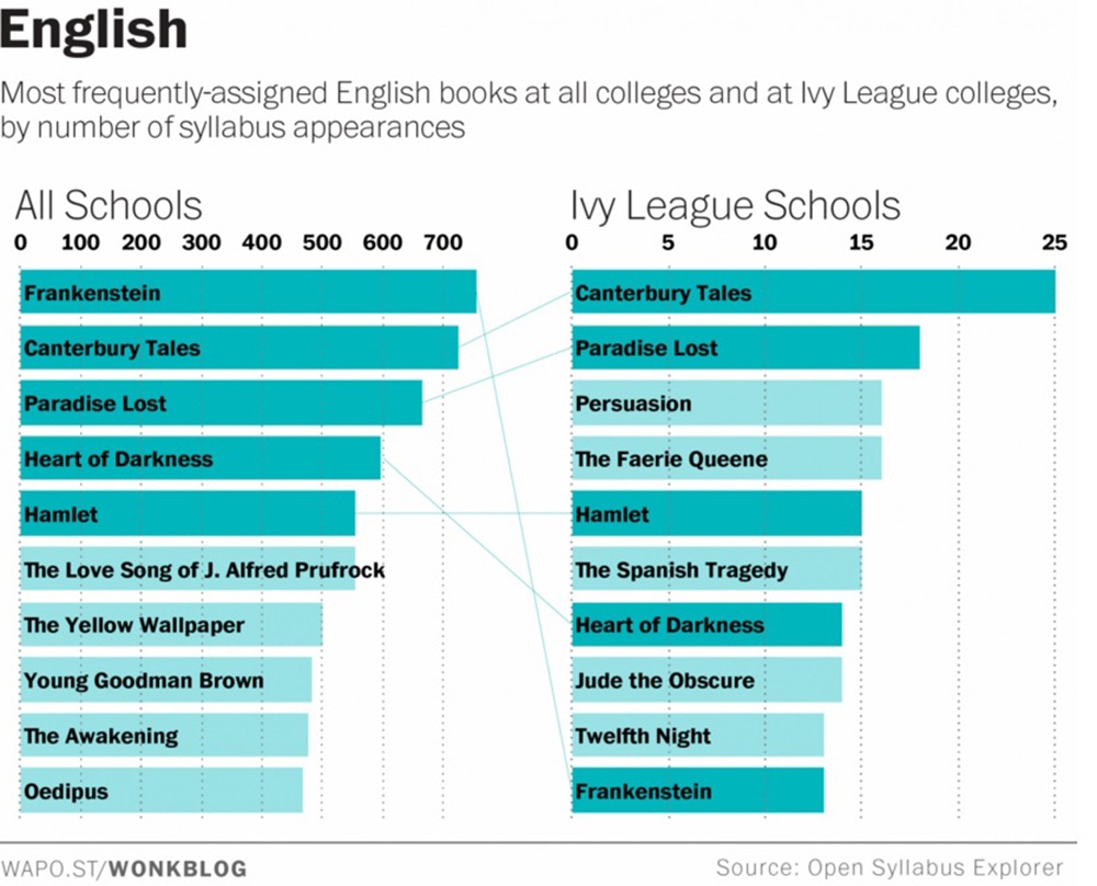Tác phẩm được các trường Mỹ giảng dạy nhiều nhất là Frankenstein của Mary Wollstonecraft Shelley. Tại Ivy, cuốn phổ biến nhất là Canterbury Tales (Chuyện kể ở Canterbury) của Chaucer.