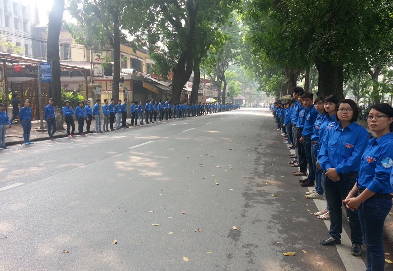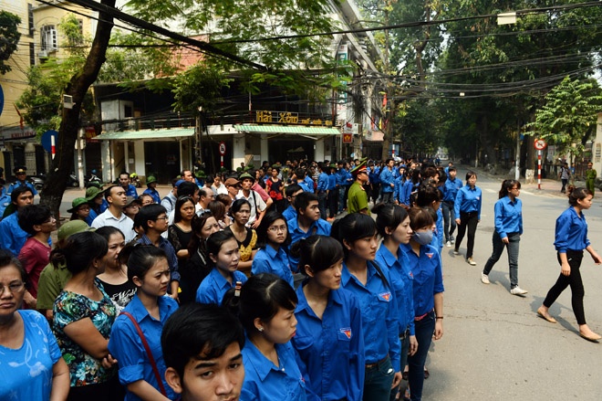 | Sáng sớm, sinh viên đã xếp thành hàng dài để hỗ trợ công tác trật tự ở khu vực ngoài nhà tang lễ số 5 Lê Thánh Tông. |