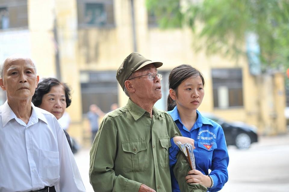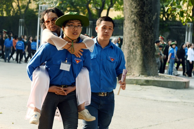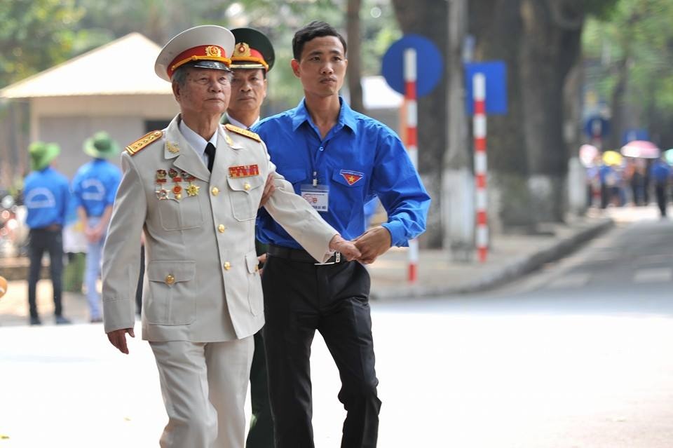 | Nam thanh niên tình nguyện giúp đỡ một cựu chiến binh vào viếng Đại tướng. |