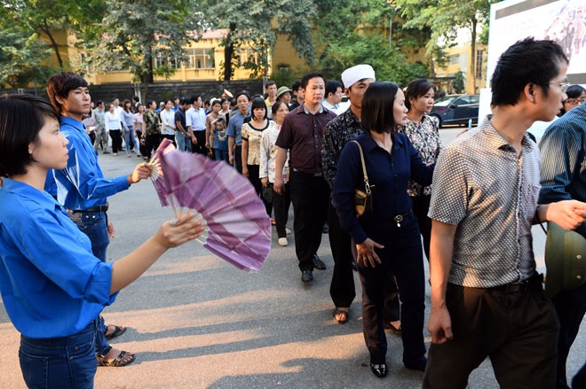 | Nhiều bạn trẻ khác dùng quạt để xua đi cái nóng cho dòng người vào viếng. |